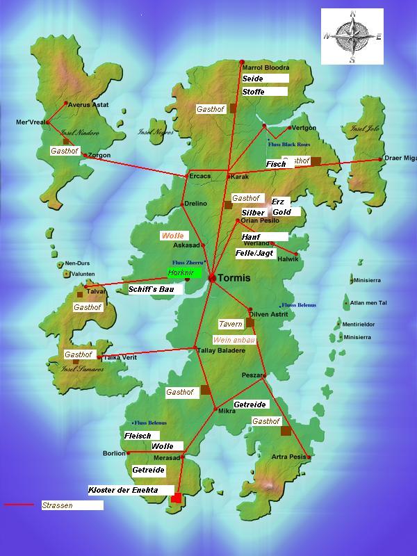 Estor Estor ist eine von vier Insel . Sie ist die größte und auch die Hauptinsel. Ihre Landschaft besteht aus großen Wäldern karge Landstriche, wechseln mit sanften Hügeln und kleinen Tälern, in dem sich die Dörfer der Bauern befinden. Das Klima auf Estor besteht aus feuchtwarm im Süden über frostig im Norden. Umgeben wird Estor von drei anderen Inseln . Im Westen liegen die Inseln Samaros und Niedere . Im Osten die Insel Jolo. Weiter gibt es noch ca. zwanzig kleinere Inseln. Im Herzen von Estor liegt die Hauptstadt Tormis, von der aus man alle weiteren Städte des Landes erreichen kann. Wenn man der Strasse nordwestlich folgt, erreicht man nach fünfzig Meilen die neugegründete Hafenstadt Horknir , dies ist eine neue Siedlung von freien Wikingern und ist der Herrschaftsbereich der Lubo Sippe, welche bekannt ist für ihren Schiffsbau und für ihre Treue zum Königshaus von Estor. Von ihr wird auch die Löwengarde gestellt, die verantwortlich ist für die Sicherheit des Königshauses. Weiter geht es Richtung Norden am Fluss Zherru entlang, durch sanfte Hügel und weiten Grasslandschaften zu der Stadt Askasad. Von dort , werden durch ihre großen Schafsherden bekannt die feinste Askasadwolle geliefert. Weiter geht es von Askasad zu den Städten, Drelino und Ercacs. Beides sind kleine aber nicht unbedeutende Hafenstädte, von wo so manche große Reisen in ferne Länder gestartet wurden. Von Ercacs erreicht man über den Seeweg die Insel Niedere . Der Zielhafen ist Zorgon von dem man aus die Städte Vreal und Averus Astat erreicht. Zwischen Zorgon und Vreal liegt auf halber Strecke der Gasthof *Zum Einhorn*, wo müde Wanderer eine Rast machen können. Die Stadt Averus Astat liegt am Berg Astat von der auch der Astat Marmor kommt . An der Grenze von Averus Astat Richtung Norden liegt das Nebeltal, welches bis jetzt noch nicht erkundet und noch nicht erschlossen wurde. Von der Insel Niedere werden edle Hölzer nach Tormis und in allen bekannten Länder verschifft. Weiter geht es wieder auf der Hauptinsel Estor. Von der Stadt Ercacs Richtung Süden kommt dann an einer Gabelung an der die Stadt Karak liegt. Wenn man sich von Karak Richtung Norden begibt erreicht man nach einer mehrtägigen Reise den Gasthof *Tandros* welcher am Fuße des Berges Tandros liegt. Hat man sich dort etwas erholt geht die Reise weiter durch ein sanftes blühende Tal Richtung Norden nach Marrol Bloodra , am nördlichen Ende von Estor. Dort wird die feinste Seide von Estor hergestellt und von dort kommen die edlen Stoffe für das Königshaus. Hält man sich aber von Karak Richtung Süden kommt man nach einer kurzen Zeit zu dem Gasthof * Silverbarren* welcher am Rande des Gebirgszuges Pesilo liegt. Dort liegt auch die Stadt Orian Pesilo, mit ihren Erz-Silbervorkommen und einer Garnison des Hauses Estors. Von Orian Pesilo geht es Richtung Nordost durch eine kleine Schlucht nach Wertland, wo Hanf angebaut wird und sich eine große Seilmacherei befindet. Richtung Osten liegt die Stadt Halwik, von der Felle, Wild und Fisch geliefert wird. Zurück Richtung Süden an Tormis vorbei liegt die Stadt Dilven Astrit mit der Taverne *Eulennest*. Sie liegt an sanften Hügeln und baut genau, wie die Stadt Tallay Baladere, mit ihren Weinbergen einen lieblichen Wein und Met an.